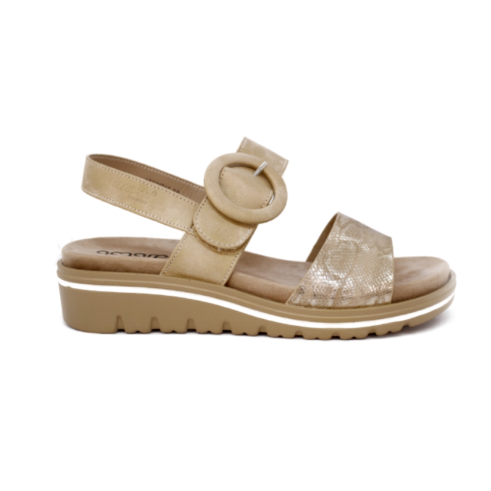 Sandalia confortable realizada en suave piel sintética. Incorpora plantilla acolchada extraíble y se ajusta mediante tira adherente oculta bajo la hebilla. Cuña baja de 4 cms.