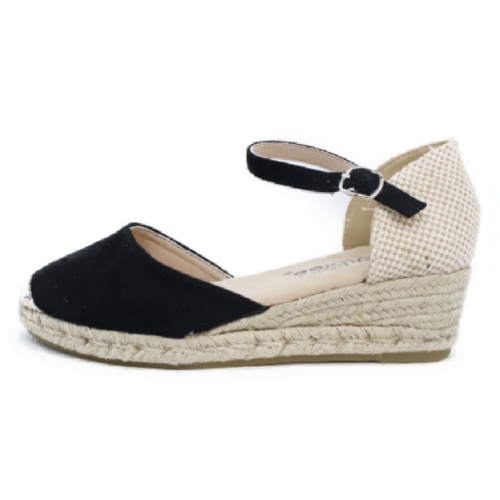 Sandalia valenciana de la marca Amerpies para mujer, realizada en material textil y pulsera de piel con hebilla ajustable que facilita su calce y ajuste al pie. Planta de piel acolchada de gran comodidad y suavidad en la pisada. Cuña de esparto y suela de goma para mayor agarre. Medidas: cuña 5 cm