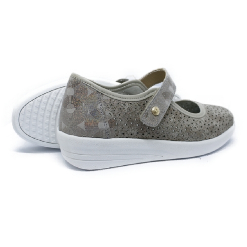 Zapato mercedes para mujer en materiales flexibles. Tiene la plantilla extraible en tejido y está acolchada. Con tira adhesiva en el empeine,  para su ajuste. El material tiene dibujo y perforaciones de adorno. La trasera y la tira de ajuste son de material al tono. Piso de goma micro ligero blanco con cuña de 2 cm.