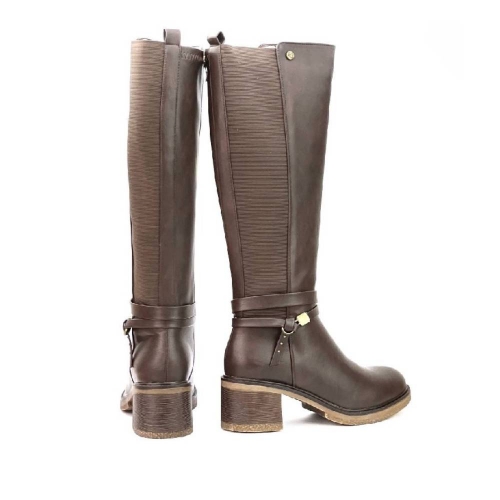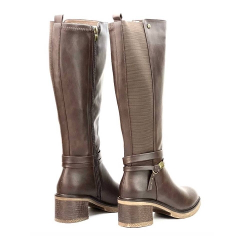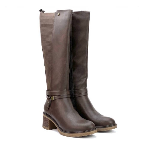 Bota amazona realizado en suave material sintético  que repele el agua. En su parte posterior lleva una tira ancha de tejido elástico que permite ajustar la anchura a gémelos anchos. Suela de caucho antideslizante con un cómodo tacón de 4 cm. Adorno de hebilla y tira de cuero.
