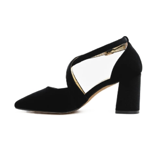 Este zapato de terciopelo negro con tacón ancho combina comodidad y elegancia. Su correa cruzada estiliza el pie, mientras la plantilla de piel acolchada asegura suavidad en cada paso. Un diseño estable y refinado para lucir con confianza en cualquier ocasión.