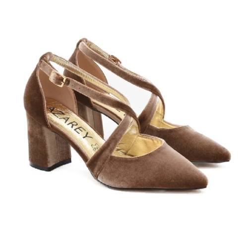 Estos zapatos de tacón ancho confeccionados en terciopelo taupe ofrecen una comodidad excepcional, gracias a su diseño estable y su planta acolchada interior de piel. Las finas tiras cruzadas al tobillo realzan el diseño elegante, aportando un toque moderno y femenino que combina seguridad y estilo en cada paso.