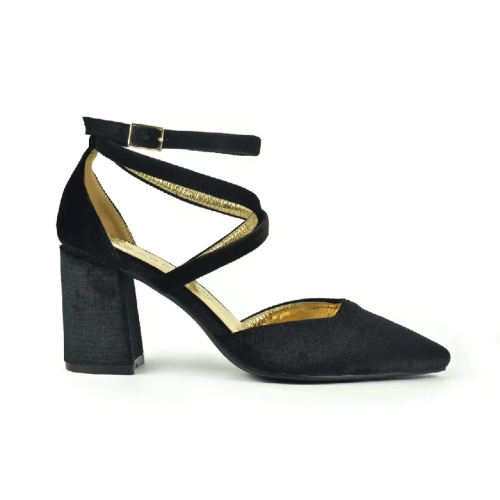 Precioso zapato de fiesta realizado  en terciopelo negro con tiras cruzadas que se abrochan en el tobillo. Puntera confortable. Plantilla acolchada en piel. Con un cómodo tacón de 8 cms.