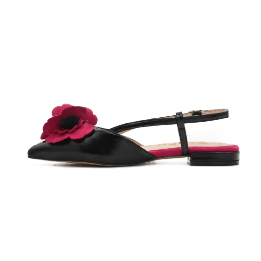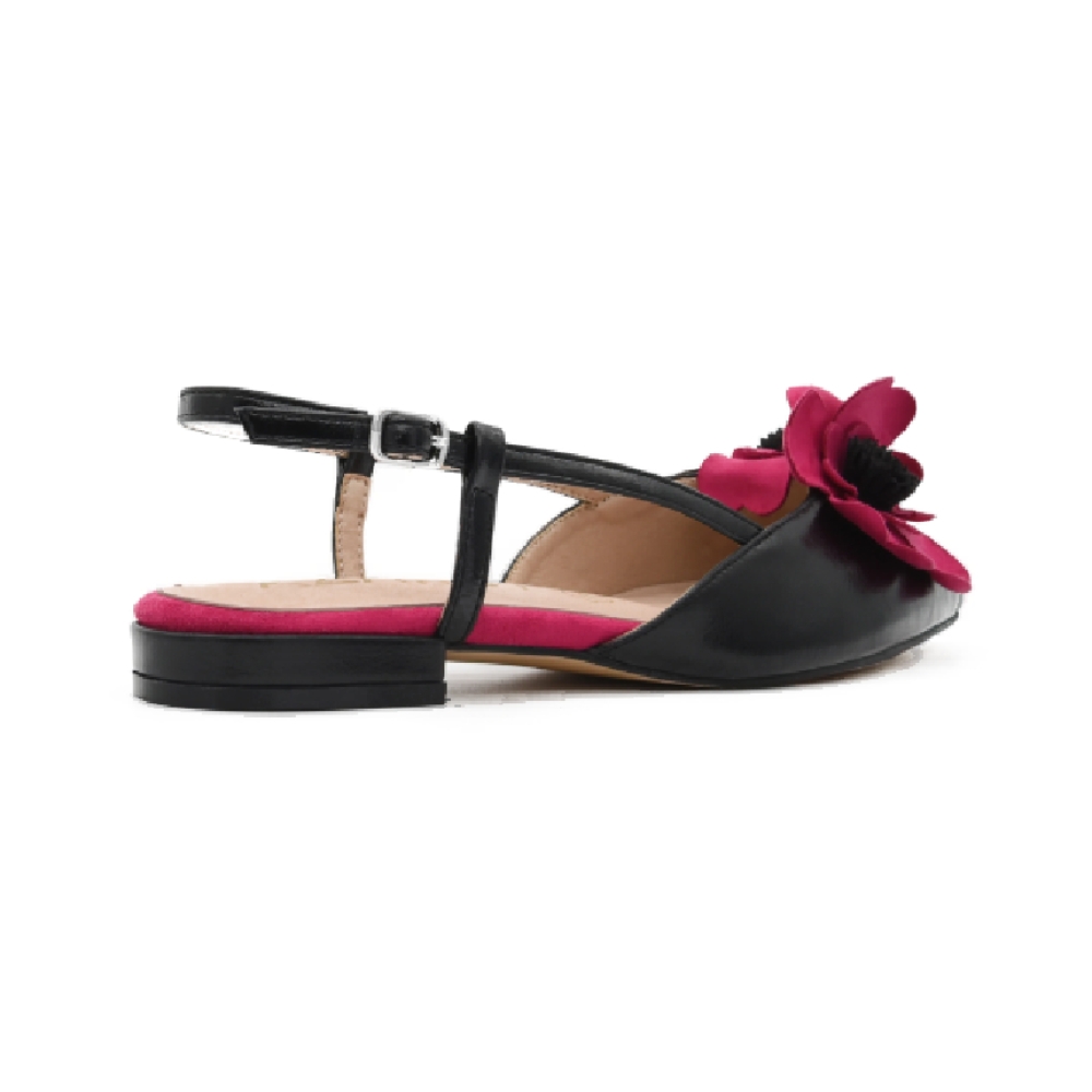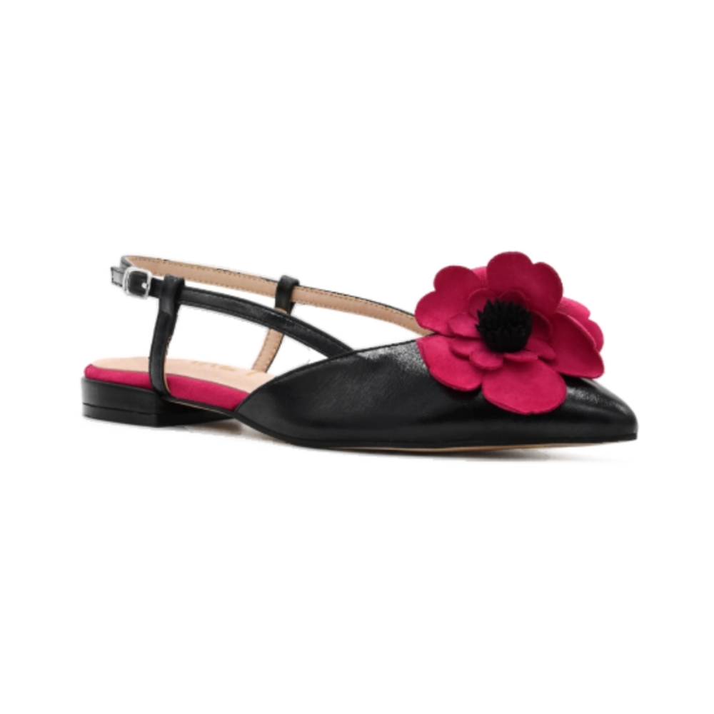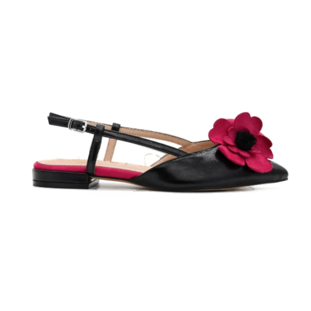 Elegante, femenina y con un toque muy especial. Esta bailarina destalonada negra destaca por su diseño sofisticado con punta fina y un llamativo detalle de flor fucsia en el empeine que aporta personalidad y un aire muy chic al conjunto.