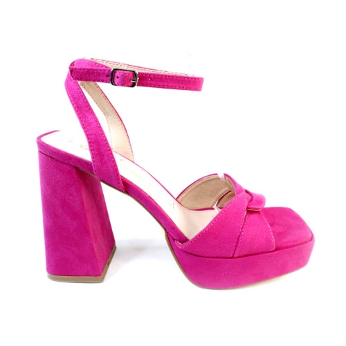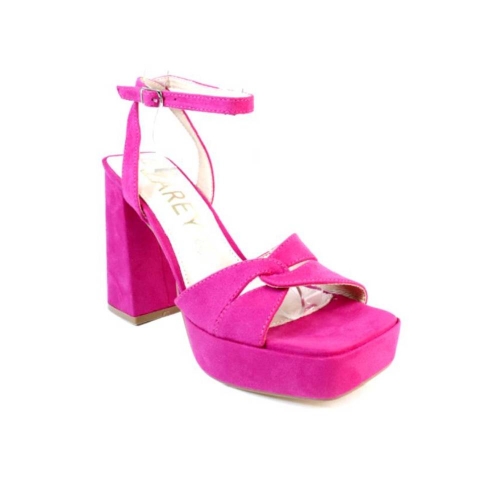 Sandalia de plataforma fucsia para mujer con dos tiras cruzadas en la pala. Cierre de hebilla y tacón ancho.