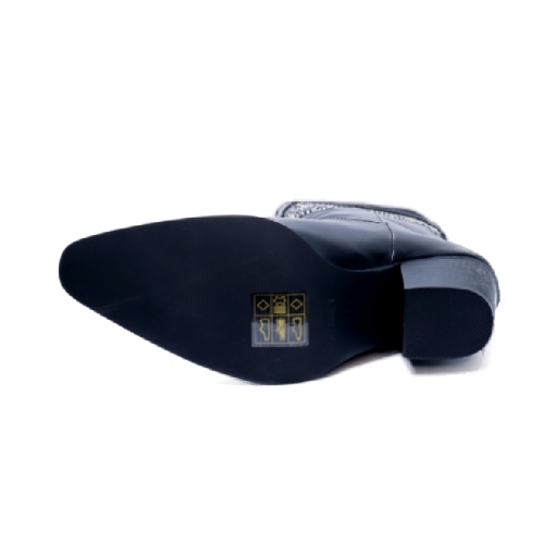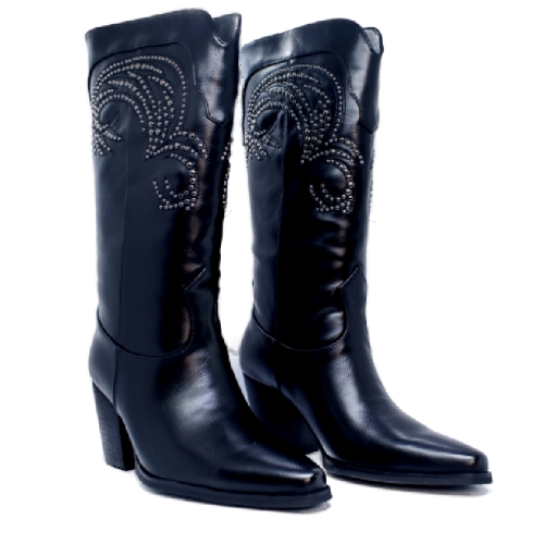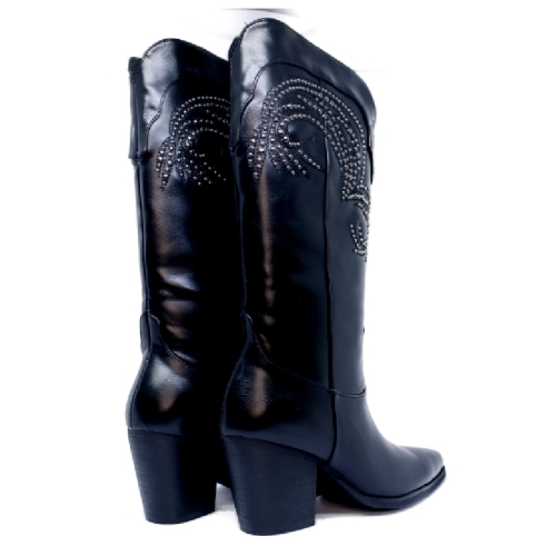 Bota estilo campera realizada en suave material vegano. Con detalles de tachuela en la parte superior. Tacón medio de 6 cm. Planta interior de piel. Se ajusta mediante cremallera interna.