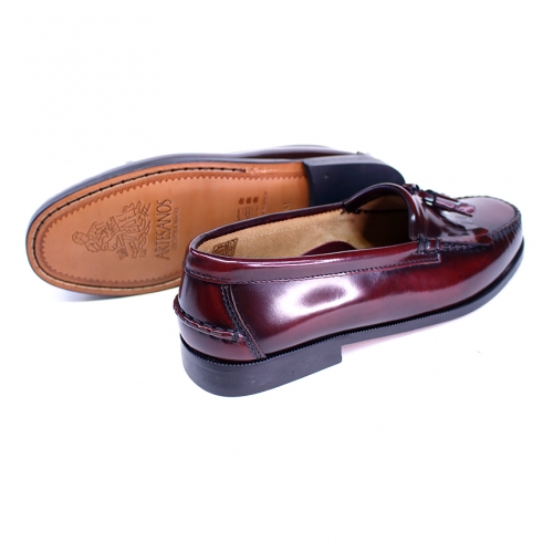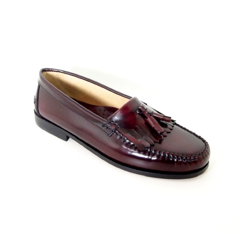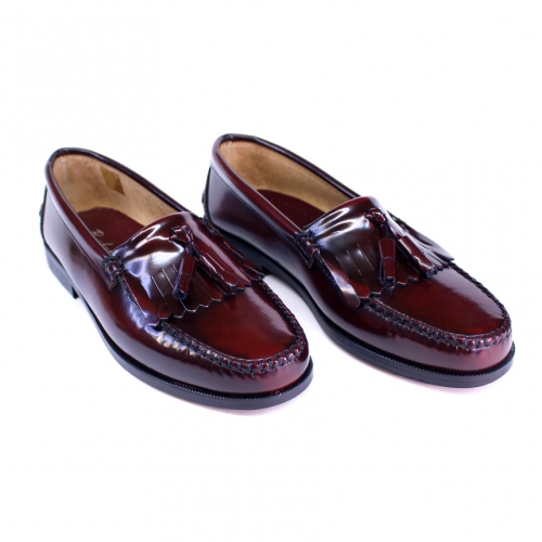 Zapato mocasín castellano de pala corta  fabricado en  España en piel florentín de color granate. Además de borlas tiene flecos. Incorpora una plantilla de cuero que evita que el pie se calienten y  la sudoración del mismo. El sistema de fijación de la suela de cuero es pegado y cosido