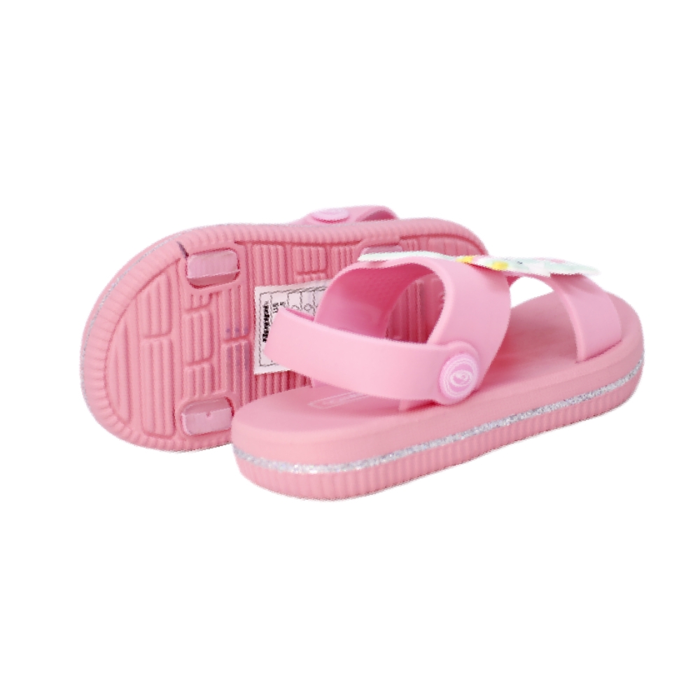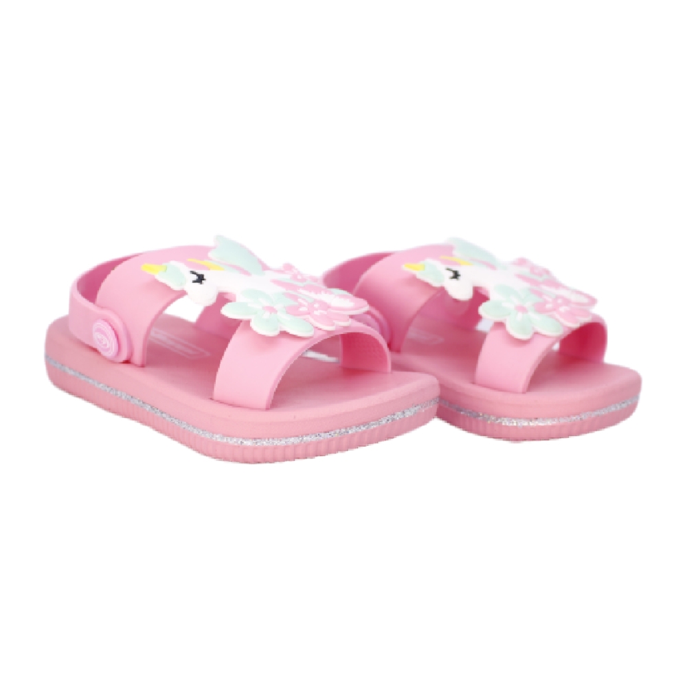 Chancla goma niña con tira de quita y pon según necesidades. Realizadas en suave goma y con una imagen de unicornio en la pala.