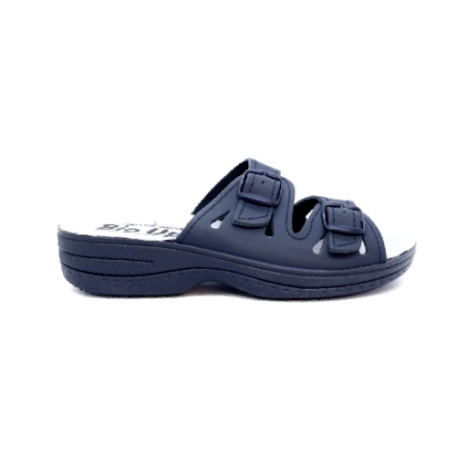 Sandalia tipo pinki, es decir, sin tira en el talón hecho en piel y con dos velcros de ajuste. El piso es de goma y es mullido, proporciona una pisada muy confortable, lo que le hace ser recomendable tanto para casa como para la calle. La suela es de goma antideslizante.
