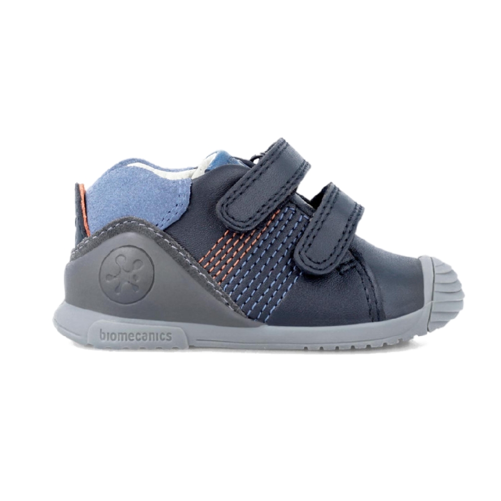BOTINES para PRIMEROS PASOS fabricados en piel color negro con talonera en serraje azul y pespuntes vistos