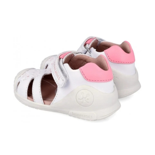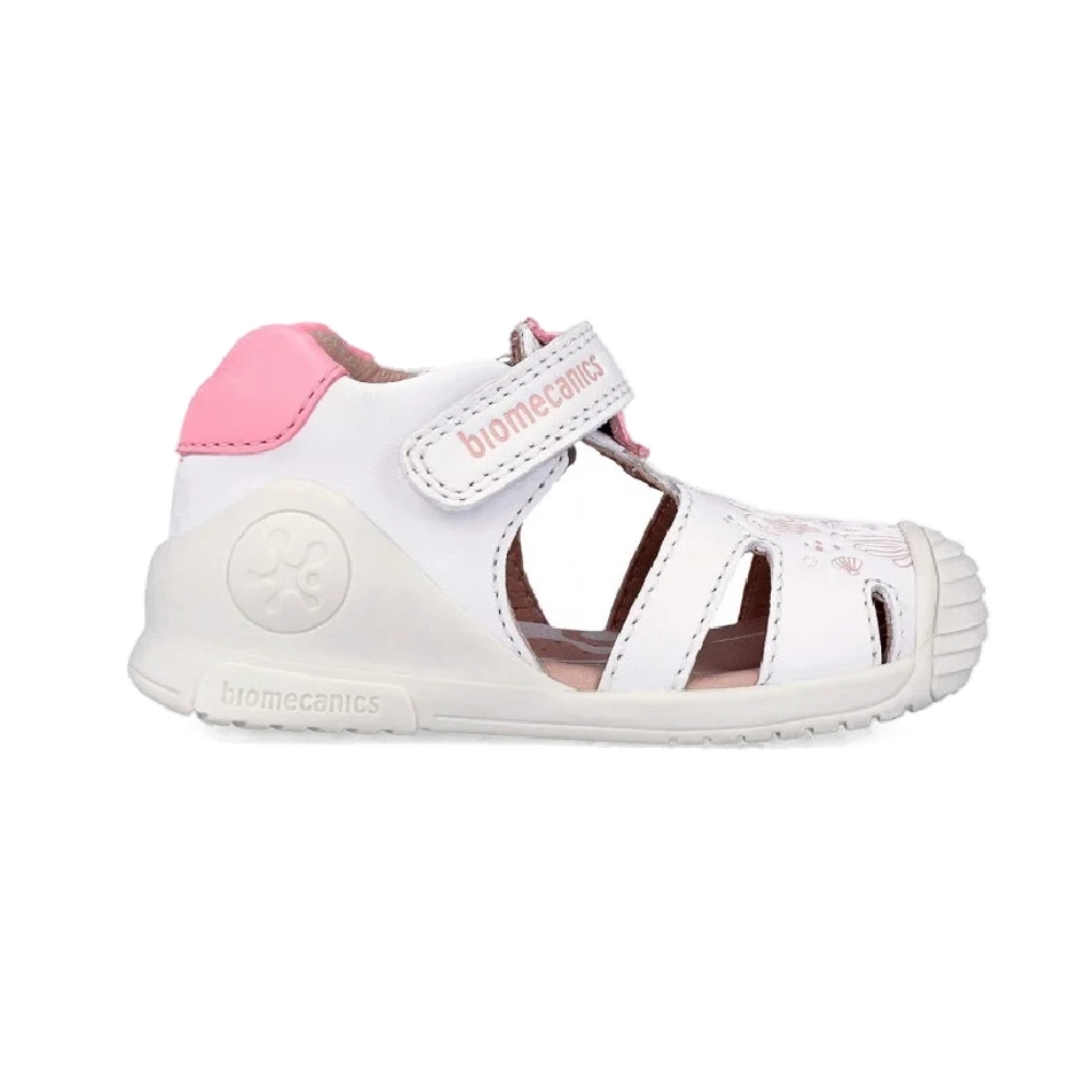 Sandalia de niña en piel con grabado oceano. Estabilizador externo diseñado para proteger sin sobreproteger en entornos no controlados con libertad de movimiento, blandito y flexible. Puntera redonda y reforzada para una mayor durabilidad. Plantilla plana sin arco plantar y transpirable. Cierre con tira adherente.