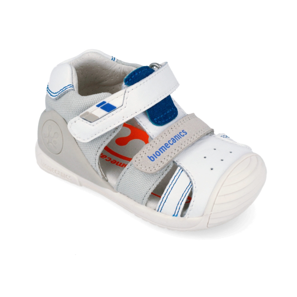 La sandalia Biomecanics 262123-B en color blanco con detalles en gris es el calzado ideal para los primeros pasos de tu bebé. Diseñada bajo la supervisión del Instituto de Biomecánica de Valencia (IBV), este modelo combina seguridad, flexibilidad y confort para acompañar el desarrollo natural del pie en sus etapas de gateo y marcha temprana.