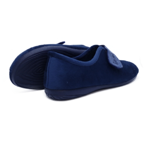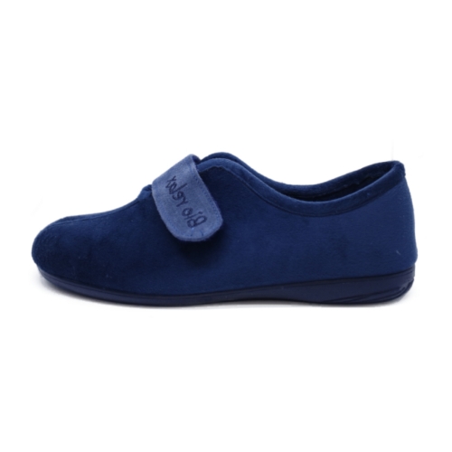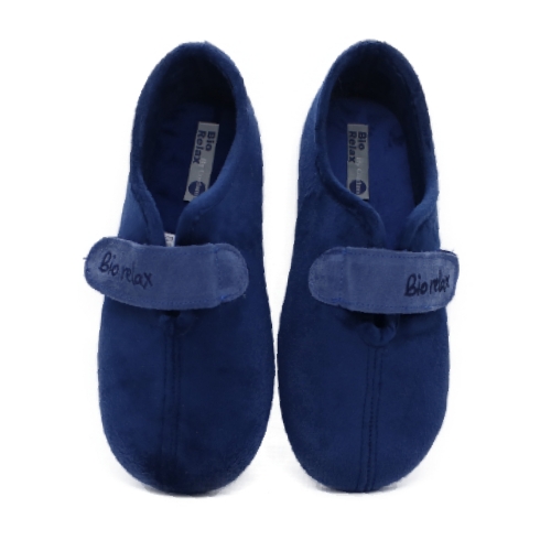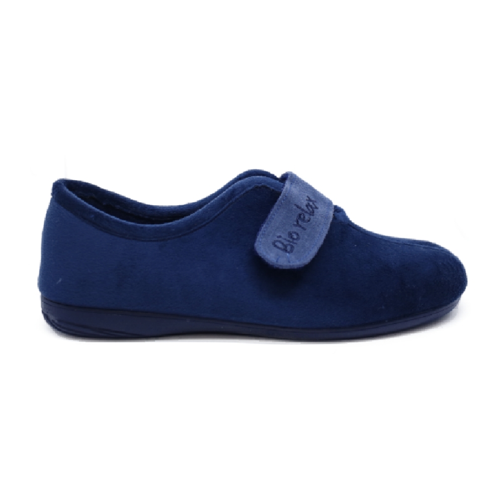 Zapatilla caballero cerrada bio relax, color azul, con cierre adherentepara calzarse facilmente, horma ancha, especial pies con problemas. Hecha en España con paños muy calidos y suaves, piso caucho natural con  una gran elasticidad antideslizante. Admite lavadora.