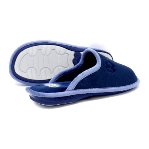 Zapatilla de casa descalza para hombre, de la marca Cosdam combinada en dos tonalidades de azul, oscuro y claro. Fabricada en material textil de primera calidad, con forro interior aterciopelado súper suave al tacto y calentita. Plantilla muy cómoda, con efecto Biorelax que ofrece máximo confort y bienestar para tus pies. Suela de goma antideslizante al tono, con la palabra 'Biorelax' grabada en el lateral externo.