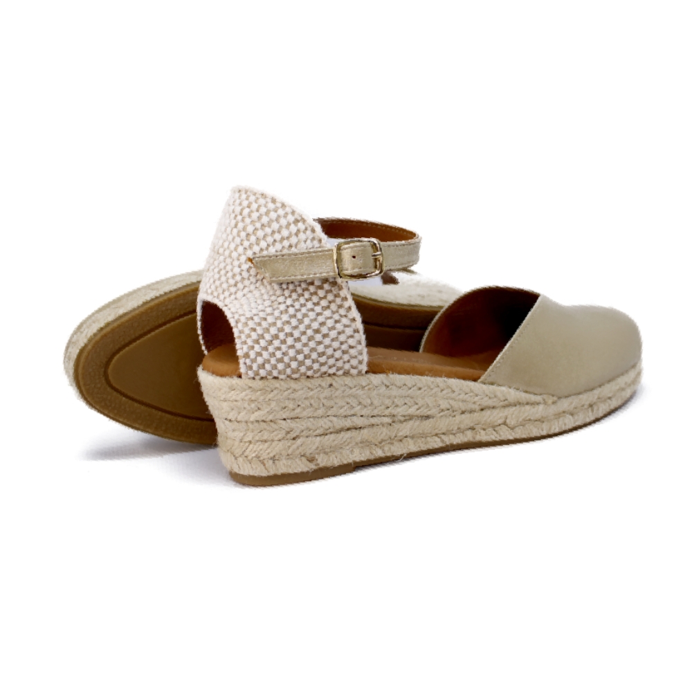Alpargata de cuña baja de yute de 5 cm, fabricada en piel metalizada de alta calidad, con plantilla de piel acolchada, pulsera al tobillo y cierre mediante hebilla para una sujección óptima. Con puntera redondeada y escote en forma de "V" para ofrecer una imagen estilizada de nuestros pies. Comodidad, durabilidad y versatilidad de un calzado 100% español.