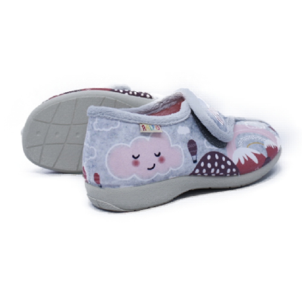 Zapatillas de casa niña  con dibujo de un dulce paisaje en tonos rosas un dibujo clásico para las más peques de la casa, con cierre adherente y suela de goma antideslizante. Fabricadas en España. Unas zapatillas para estar calentito en casa