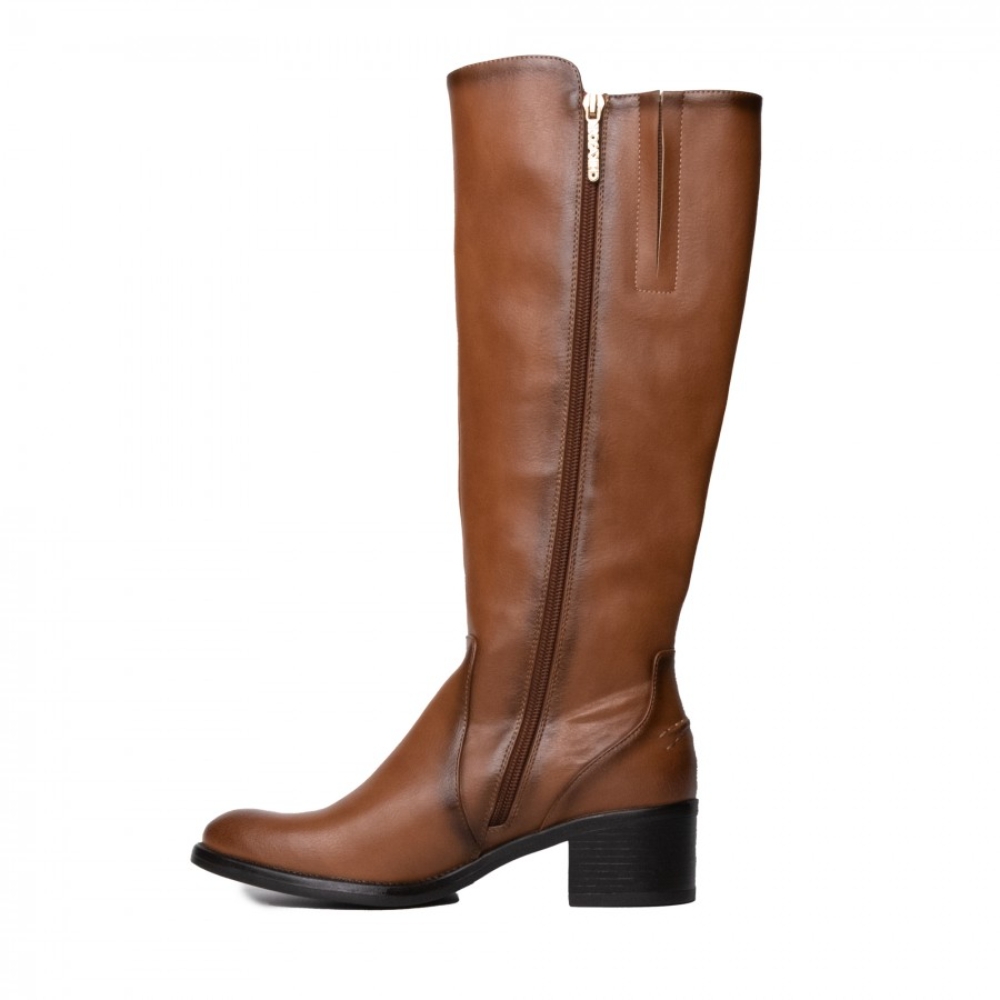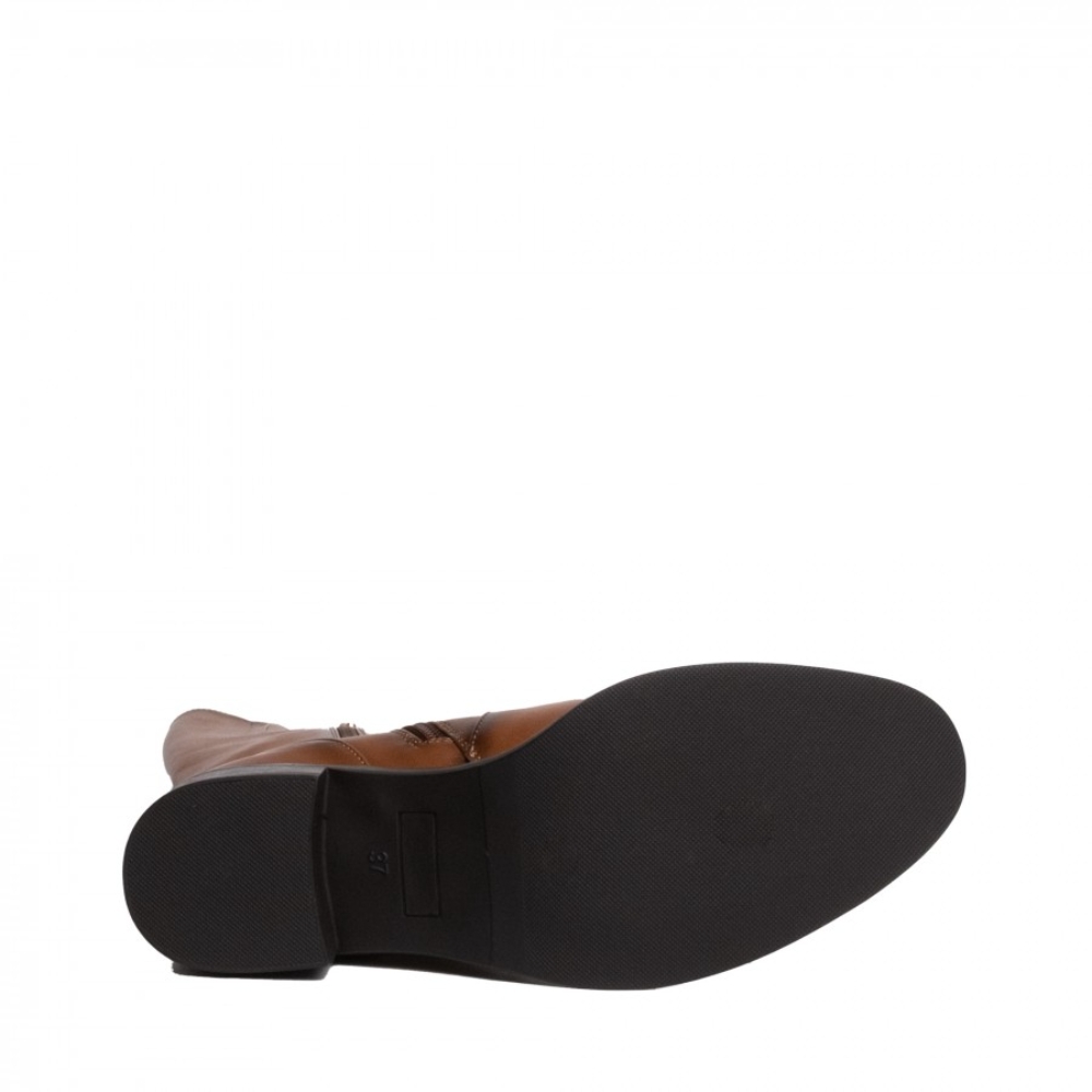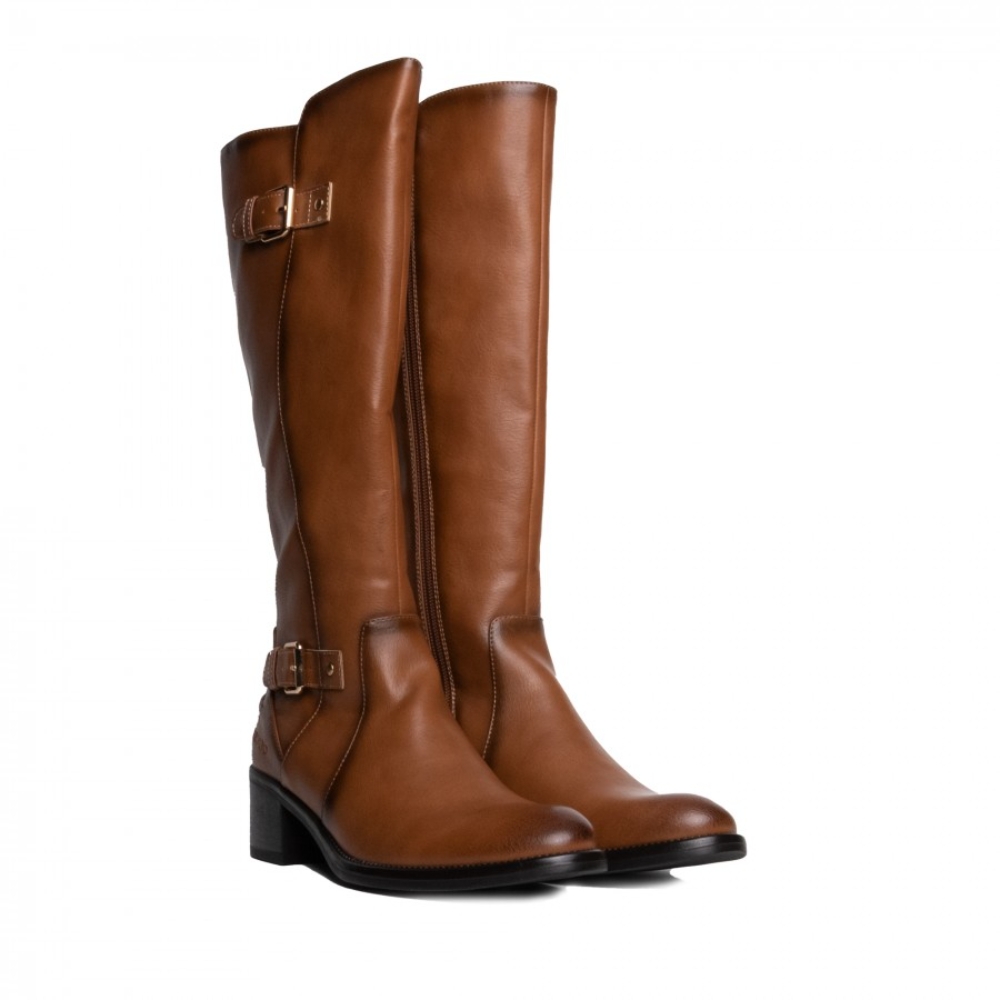 Bota alta de señora color cuero. Corte clásico caballista con doble tira con hebilla. Material efecto piel cepillada. Cremallera interior y punta almendrada. La suela tiene un pequeño tacón, es de color marrón y acabado antideslizante.