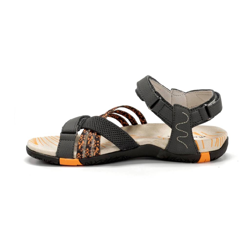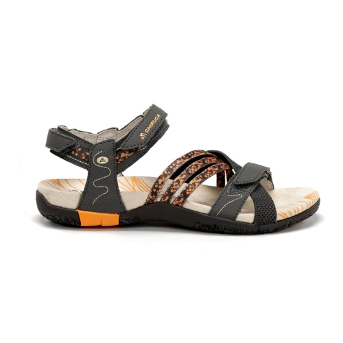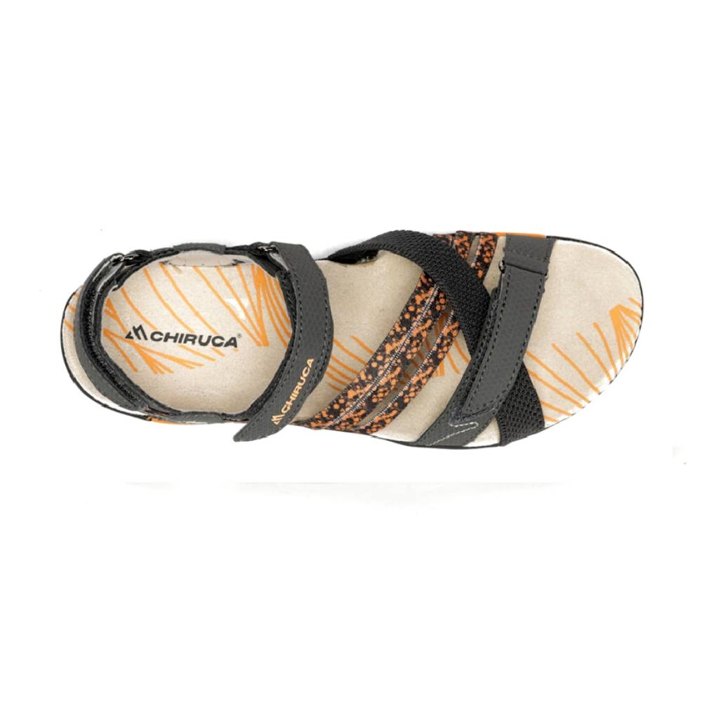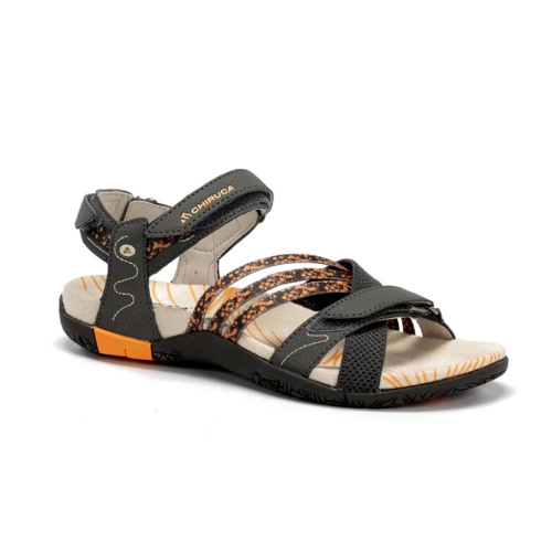 Diseñadas específicamente para la anatomía femenina, las sandalias Chiruca Soller 08 en combinación de gris y naranja son la elección perfecta para quienes buscan un calzado híbrido: la frescura de una sandalia con la protección y agarre de una bota de montaña ligera.