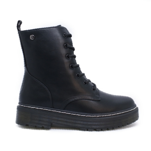Bota militar de mujer, con cierre de cremallera lateral y cordones. Modelo cómodo, fabricado en piel sintética, con suela de goma. Altura plataforma 3,5 cm. Altura caña 16 cm. Color negro. Ideal para combinar con un look trendy.