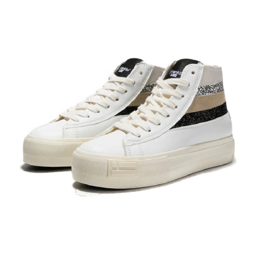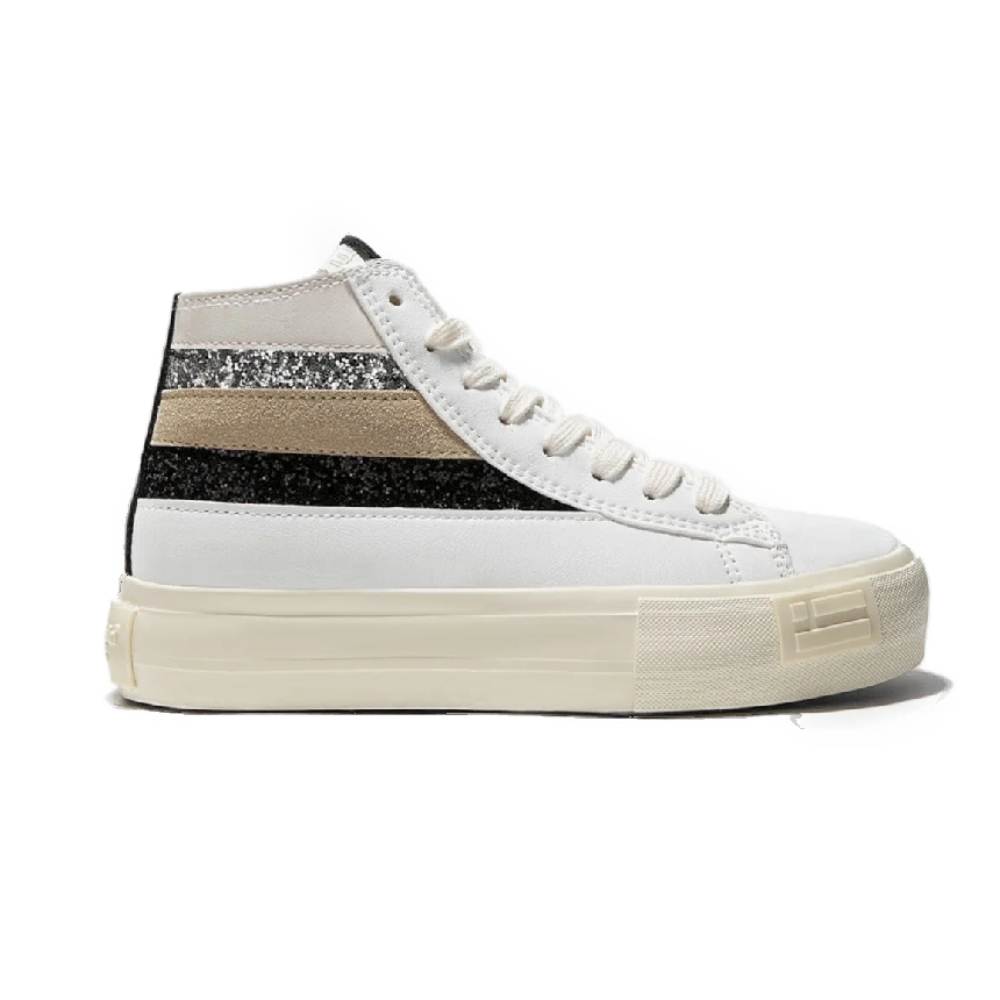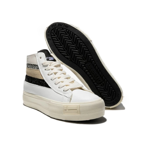 Este modelo está construido en piel sintética blanca y una combinación de franjas en su lateral de microfibra. Glitter negra y plateada, y franjas de piel sintética blanca y beige conforman este diseño abotinado. Suela de goma monocolor blanca de 4 cm con emblema D.Franklin en el lateral y lettering en el talón. Plantilla interior termoconformada de EVA inyectada.