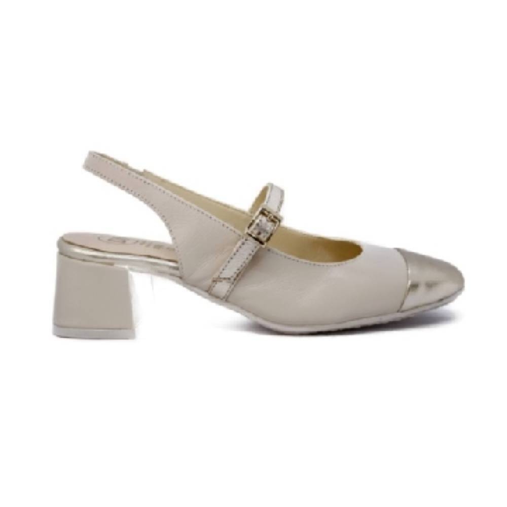 Su tacón de 4 cm ofrece la altura justa para estilizar la figura sin sacrificar comodidad, mientras que la correa ajustable garantiza un ajuste seguro y personalizado. Su acabado en tonos beige y dorados lo convierte en una opción versátil, perfecta para combinar con looks formales y semi-casuales.
