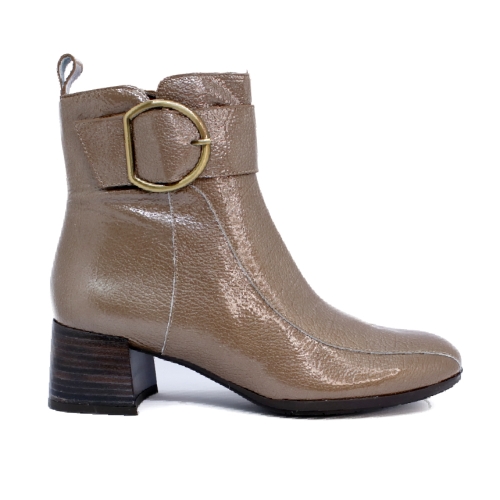 Botín de mujer realizado en piel acharolada de color taupe con un cómodo tacón de 6 cm que te proporcionará estabilidad al andar gracias a su anchura. Suela de goma antideslizante, flexible y ligera gracias a la tecnología  TOTAL FLEX.