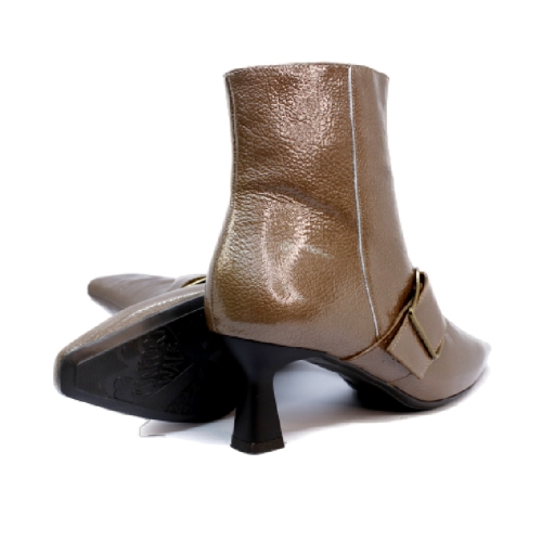 Botín fabricado en Piel Acharolada acabado Taupe. Con Adorno de Hebilla en Oro Viejo en Parte Delantera. Cierre mediante Cremallera Lateral. Plantilla de Gel, Sistema Total Flex anti impactos, Tacón con base de 4,5 cm de altura con piso engomado de 1 cm antideslizante. Fabricado en España.