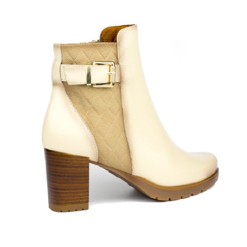 Botines con hebilla Desireé Leury 11 para mujer en color beige, con cremallera, tacón 7 cm, suela de goma termoplástica, exterior de piel y plantilla textil. Su diseño delantero hace que los dedos vayan cómodos en todo momento. Especial refuerzo de gel en los metatarsos. Suela flexible antideslizante que lo convierten en un botín ideal para el frio y la lluvia