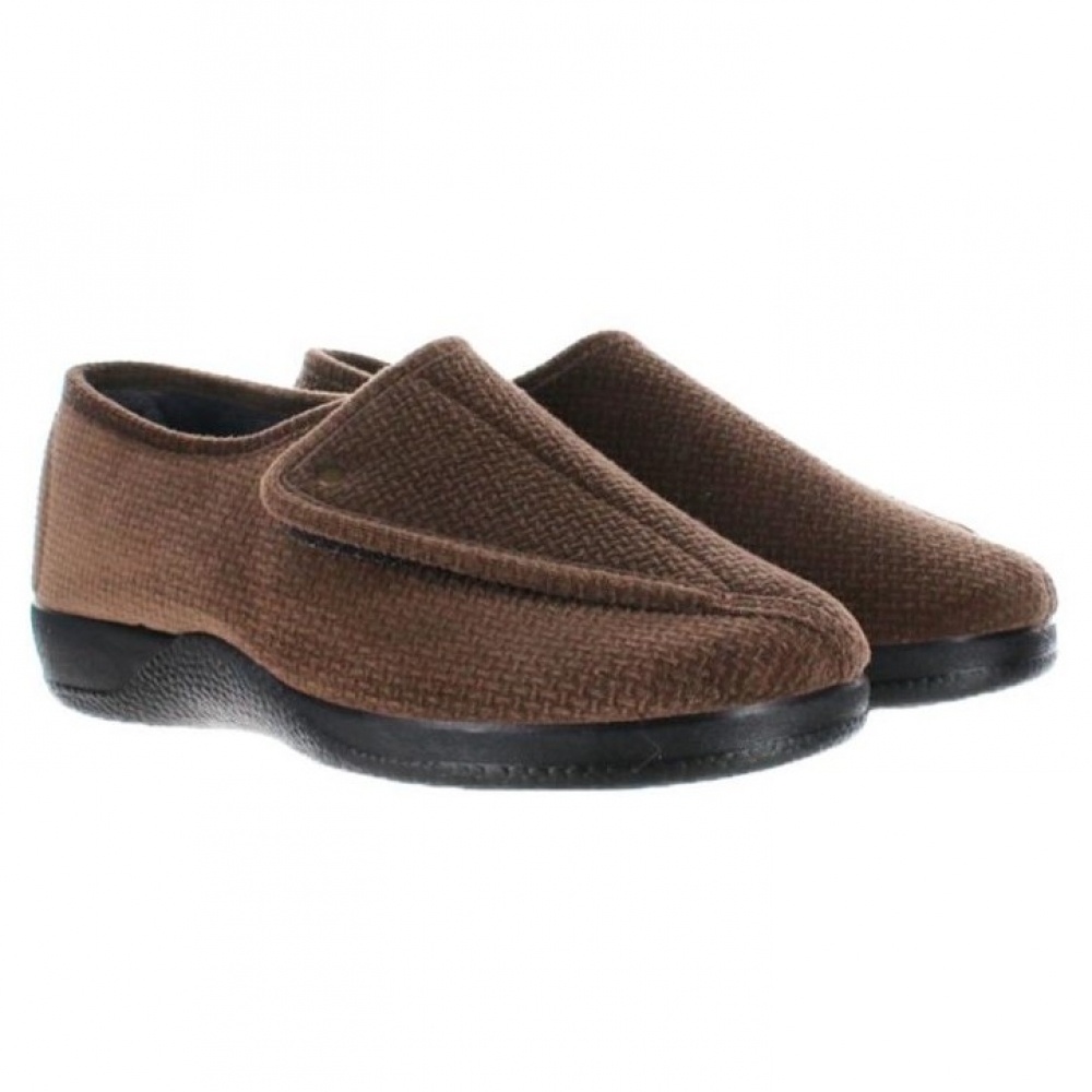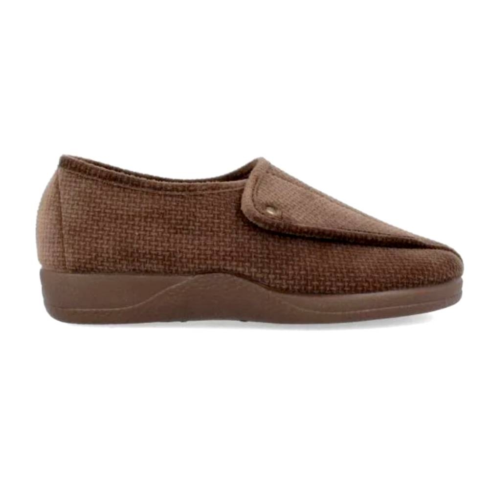 Zapatilla  marrón de mujer realizad en paño suapel que incorpora una lengüeta de velcro que la abre  totalmente permitiendo una acceso fácil a cualquier pie. Su ancho especial la hace totalmente recomendable para pies hinchados y diabéticos. No tiene ninguna costura en su interior que moleste. El tejido es termoaislante y antibacteriano. la suela de goma antideslizante tiene una altura máxima de 2 cm. Admite lavadora.