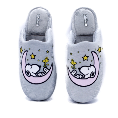 Zapatilla de casa con Snoopy en la luna.  Modelo cómodo y abrigado para los días más fríos.  Ideales para regalar y sorprender a personas queridas. Hecho en España. Modelo 1171. Color gris. relajantes, termoestables, flexibles, lavables y anti bacterias. Suela de goma antideslizante.