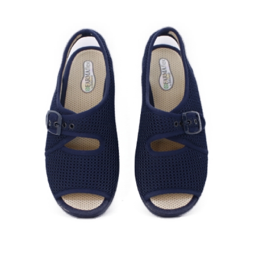 Zapatillas de casa con talón abierto y dedos fuera con cuña de 4cm, de la marca DeValverde , tiene una hebilla  en el empeine ideal para pies anchos. Forro interior en textil y suela caucho natural (latex). Chinela Ideal para mantener tus pies frescos en verano.  Fabricada con tejidos en microfibras y algodón que permiten una constante ventilación. Relleno de corcho natural para una total absorción de los posibles impactos. Respetuosos con la naturaleza. Utilizando materiales que cuidan al máximo posible el medio ambiente. Hecho en España.