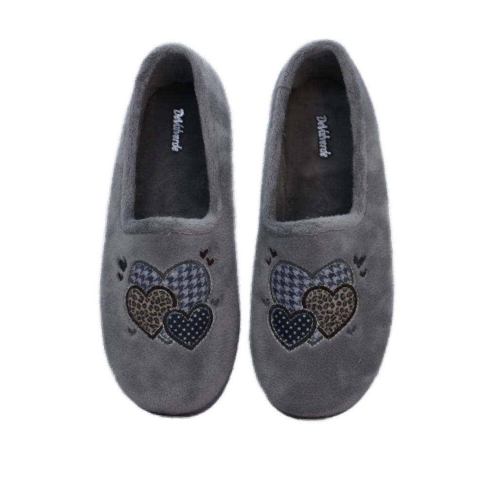 Diseño Cálido y Detallado: Presentan un acabado en tejido suave de color gris, decorado con un delicado bordado de corazones con diversos estampados que aportan un toque femenino y hogareño.