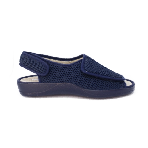 Zapatilla especial para pies delicados. Con su ancha tira adhesiva que ocupa todo el empeine, se consigue la adaptación a cualquier pie.  Realizado en tejido antibacteriano y transpirable. Suela de goma rugosa antideslizante.