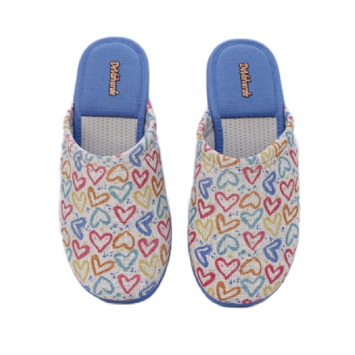 Zapatillas de estar en casa para mujer de la marca DeValverde, con puntera cerrada y un estampado de corazones en alegres tonos azules rojos y amarillos