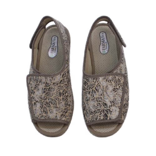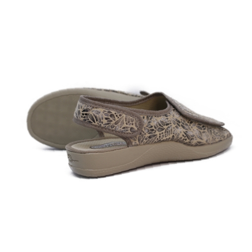Zapatilla especial para pies delicados. Con su ancha tira adhesiva que ocupa todo el empeine, se consigue la adaptación a cualquier pie.  Realizado en tejido antibacteriano y transpirable. Suela de goma rugosa antideslizante.