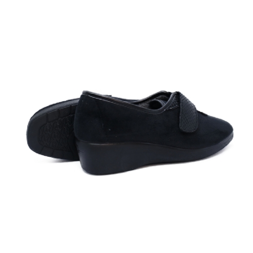 Elegante zapatilla de casa con cuña antideslizante de 4 cms, totalmente flexible. Realizada en suave y abrigado tejido aterrciopelado. Cierre con velcro para facilitar el calce