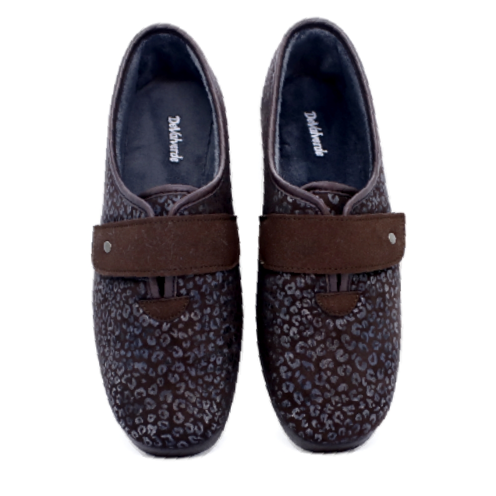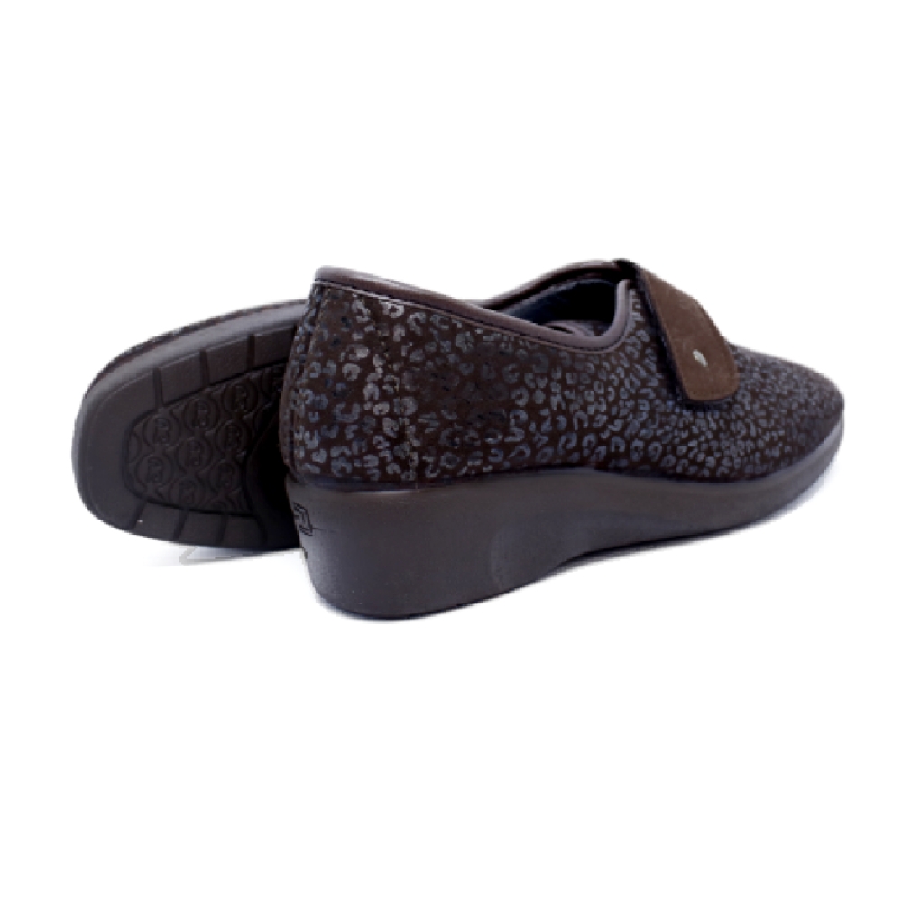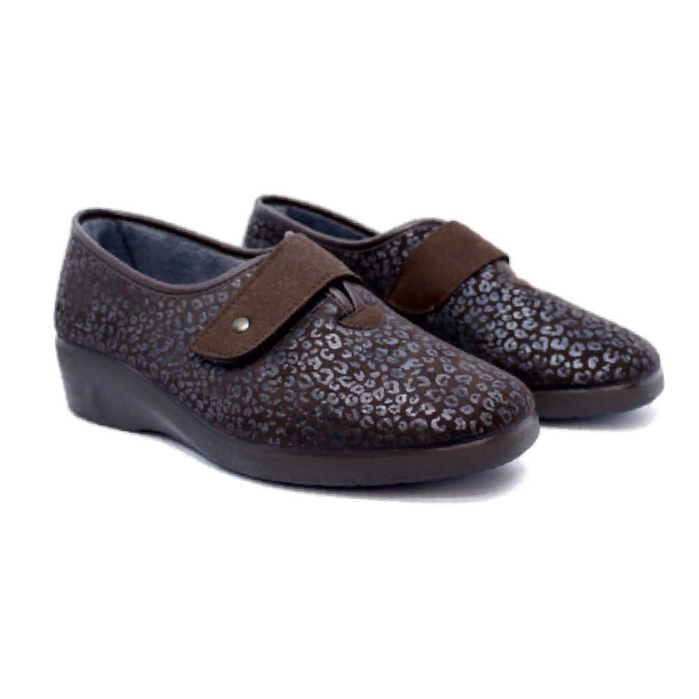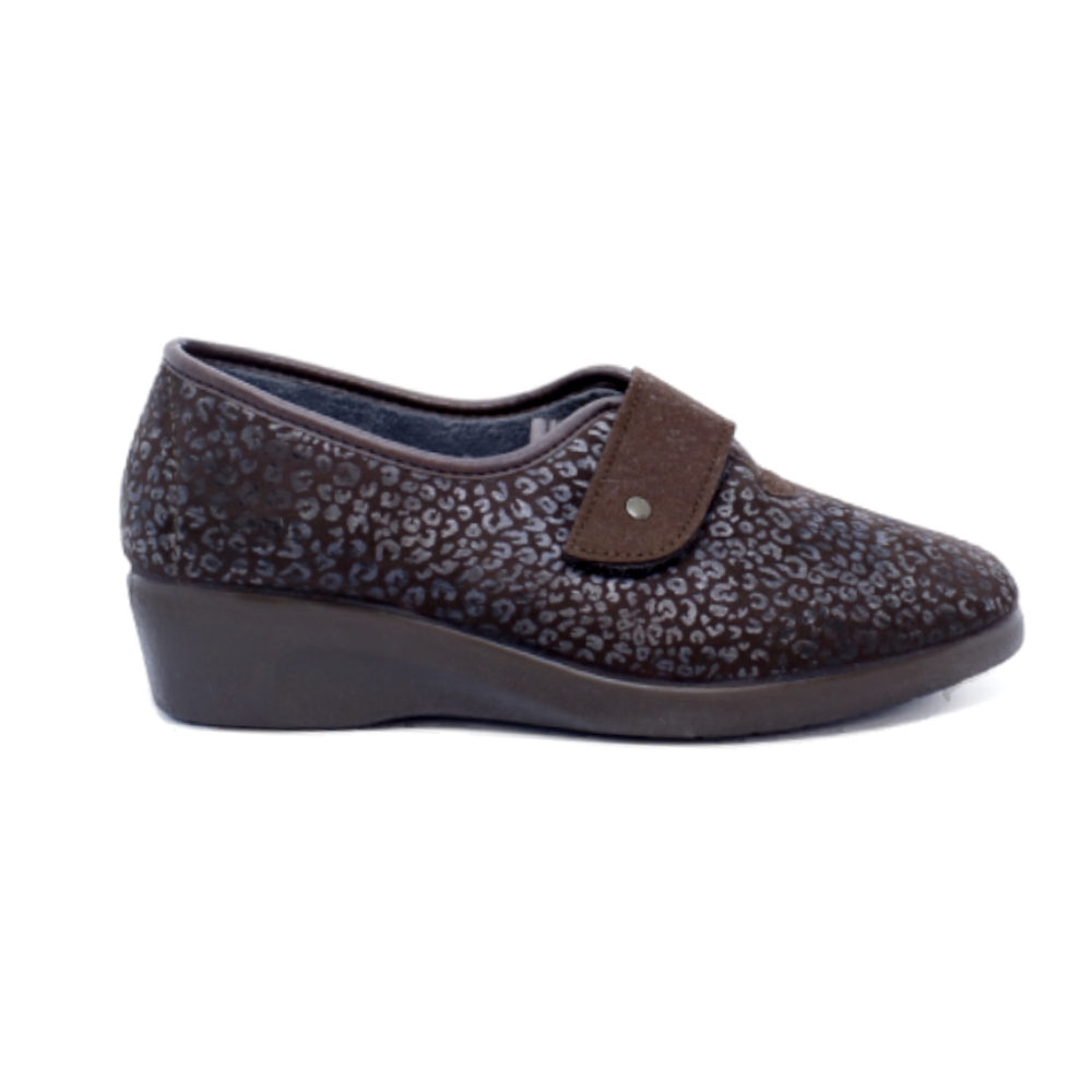 Elegante zapatilla de casa con cuña antideslizante de 4 cms, totalmente flexible. Realizada en suave y abrigado tejido aterrciopelado. Cierre con velcro para facilitar el calce