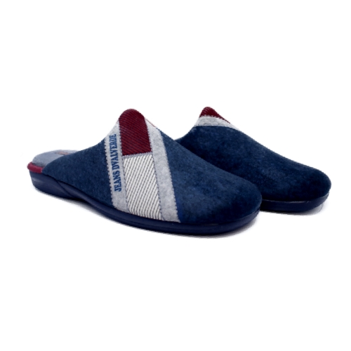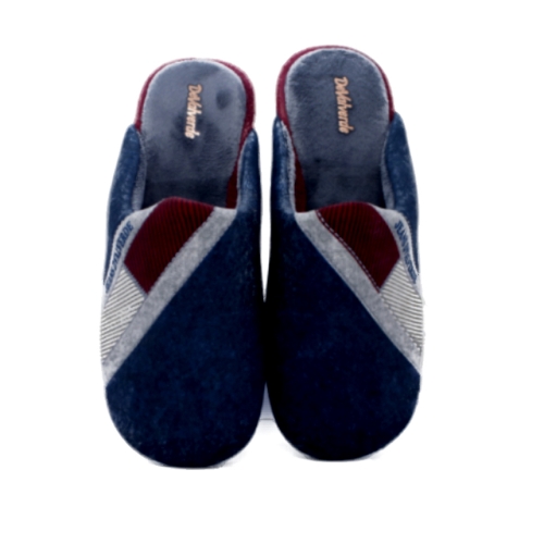 Zapatilla azul marino de estilo clásico y diseño cerrado, con detalles en gris y burdeos y una inscripción "JEANS DEVALVERDE" en el lateral. Fabricada con materiales suaves para mayor comodidad en el hogar, cuenta con una suela antideslizante que ofrece estabilidad al caminar. Ideal para quienes buscan comodidad y estilo en una pantufla de uso diario.