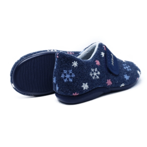 Estas cómodas zapatillas de casa para mujer  destacan por su diseño elegante y funcional. Están confeccionadas con un suave tejido azul marino, decorado con un estampado de copos de nieve y estrellas en tonos pastel.
