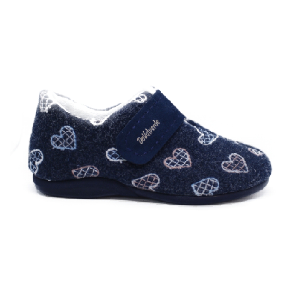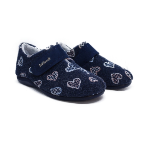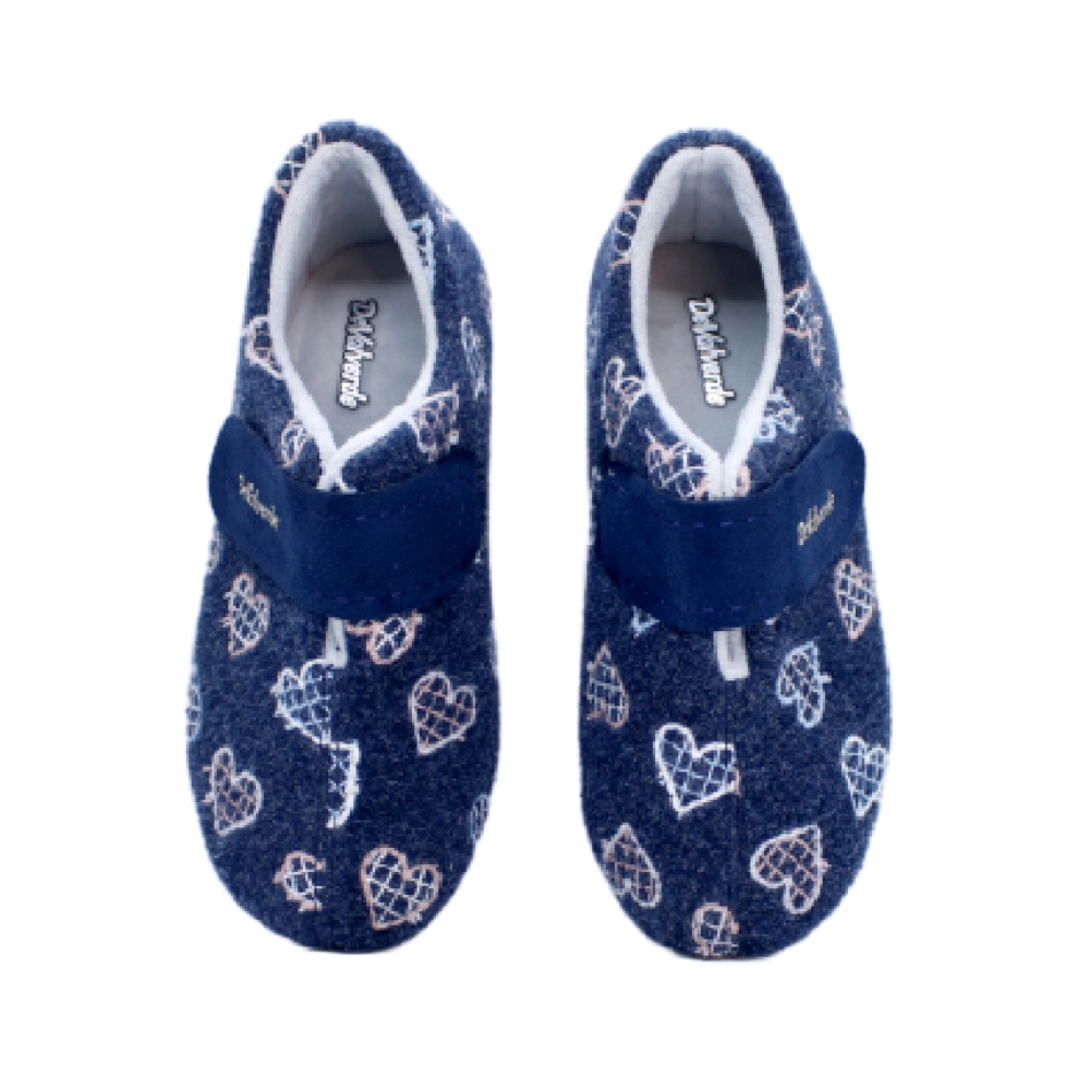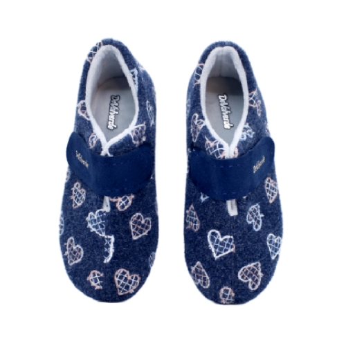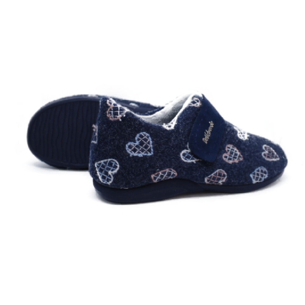 Estas cómodas zapatillas de casa para mujer  destacan por su diseño elegante y funcional. Están confeccionadas con un suave tejido azul marino, decorado con un estampado de corazones.
