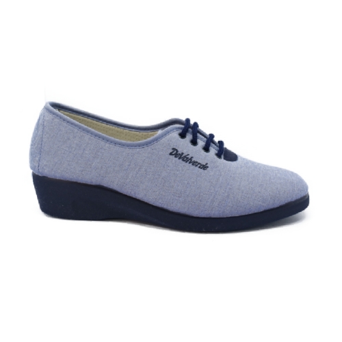 Zapatilla de cuña para mujer realizada en tejido color azul con tratamiento antibacteriano. Ajuste mediante cordones. Cuña de goma antideslizante de 3 cm.