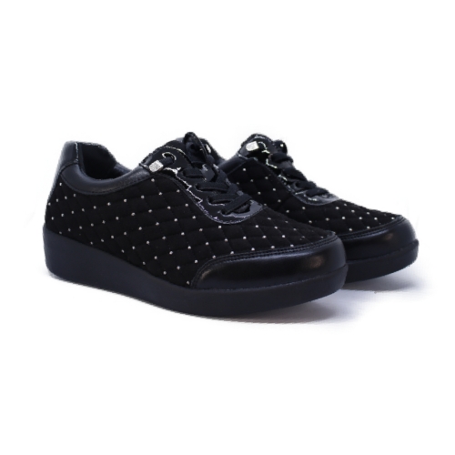 Zapato para mujer de color negro fabricado en combinación de piel sintética y textil efecto ante acolchado. Cuenta con detalle de tachuelas, cierre con cordones elásticos, plantilla extraíble, forro suave confortable y suela de cuña.