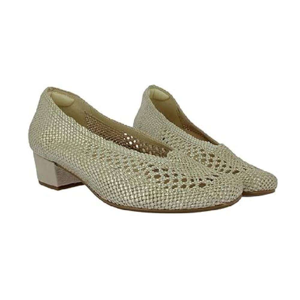 Fabricado en un sofisticado tono platino trenzado, este zapato es el complemento perfecto para bodas, bautizos y cualquier celebración. Su tacón de 2 cm ofrece la altura justa para estilizar la figura sin renunciar a la estabilidad, y su suela flexible y ligera garantiza una pisada segura.