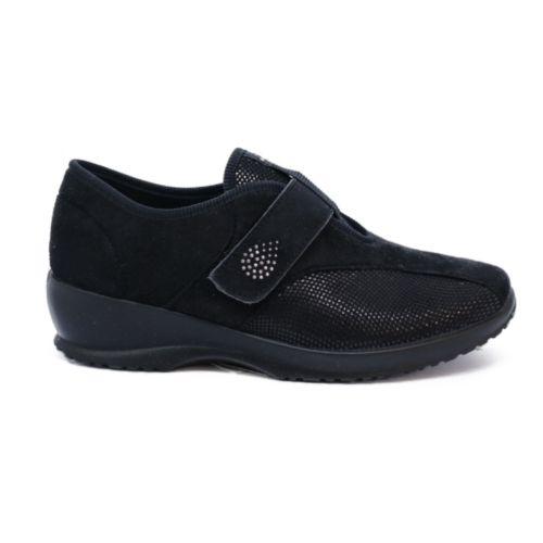 Zapato negro  con velcro cuña mujer. Zapato estilo casual fabricado en material flexible y transpirable. Este zapato destaca por tener plantilla extraíble y por ser muy adaptable tanto al pie como al tipo de pisada de cada persona. Son unos zapatos comodísimos y muy combinables, perfectos para todos los días. FLY FLOT es una marca italiana líder en el mercado internacional del calzado. Emplean las últimas tecnologías para ofrecer un calzado no sólo cómodo sino que favorezca la estabilidad osteoarticular de todo el organismo, aplicando un estilo propio, actual y centrado en el bienestar con cueros suaves y suelas anatómicas anti impacto.