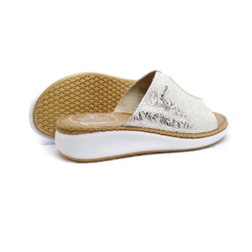 Sandalia señora ancho especial. Plantilla de piel. Suela de caucho antideslizante. Una sandalia cómoda para pies delicados. Realizada en suave material en tonos dorados y blanco, Un básico juvenil y renovado que te va a acompañar durante tus salidas.