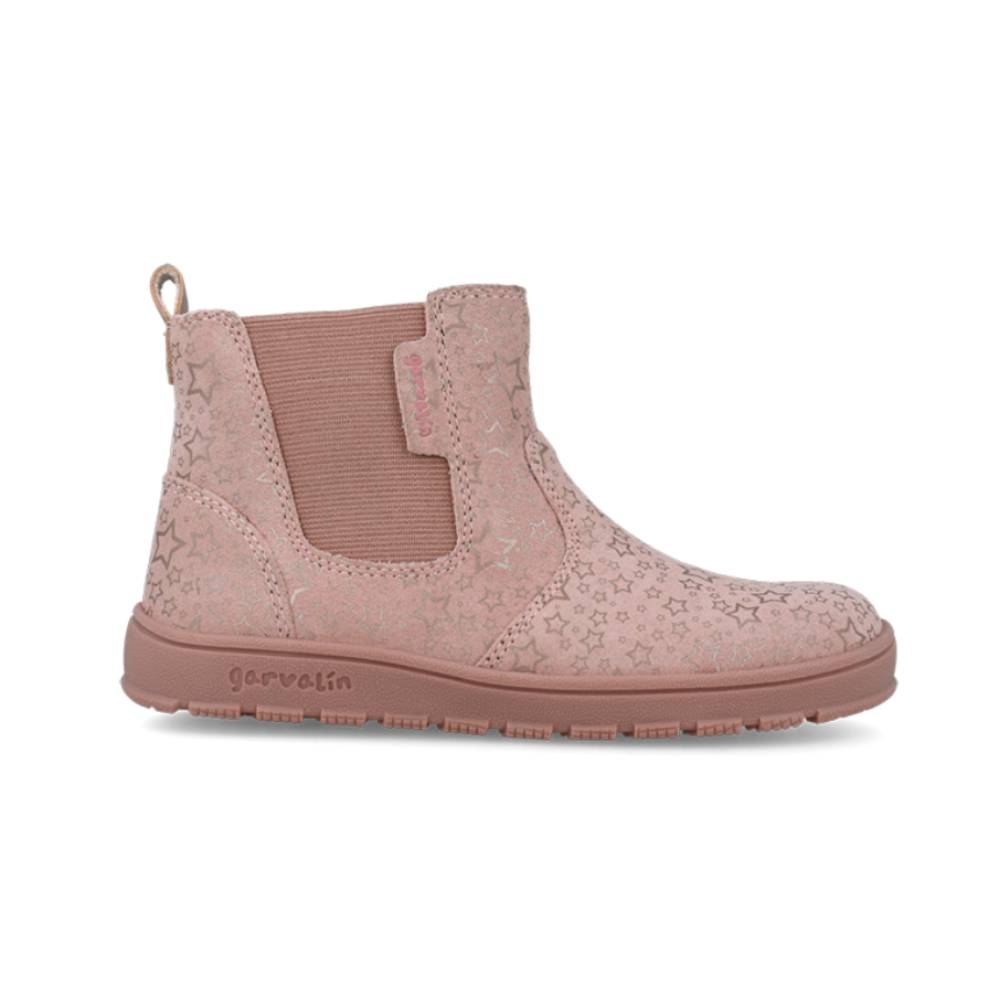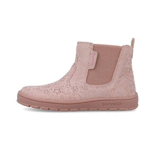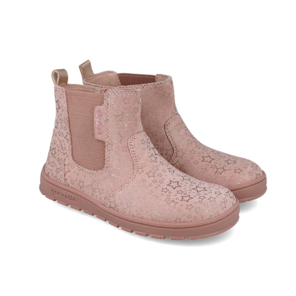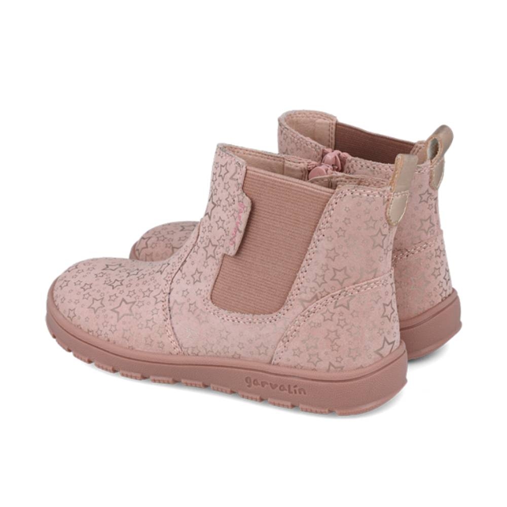 Botín rosa con estampado de estrellas, panel elástico en el lateral y tirador en la. Botas de tobillo rosas con una superficie texturizada que presenta un  bonito estampado sobre la piel. Plantilla extraíble, cremallera interna, drop 0