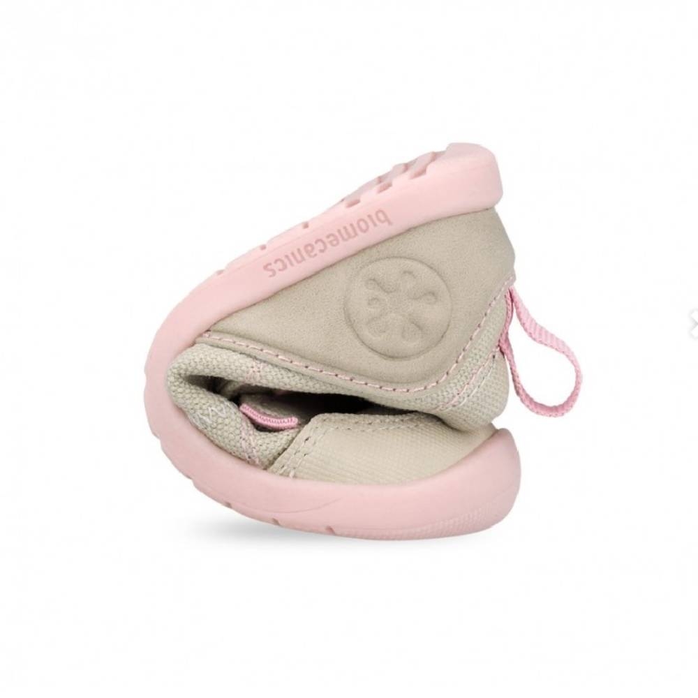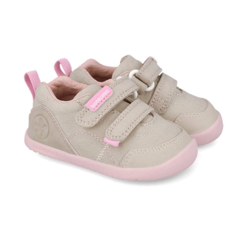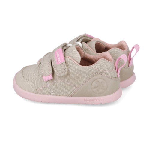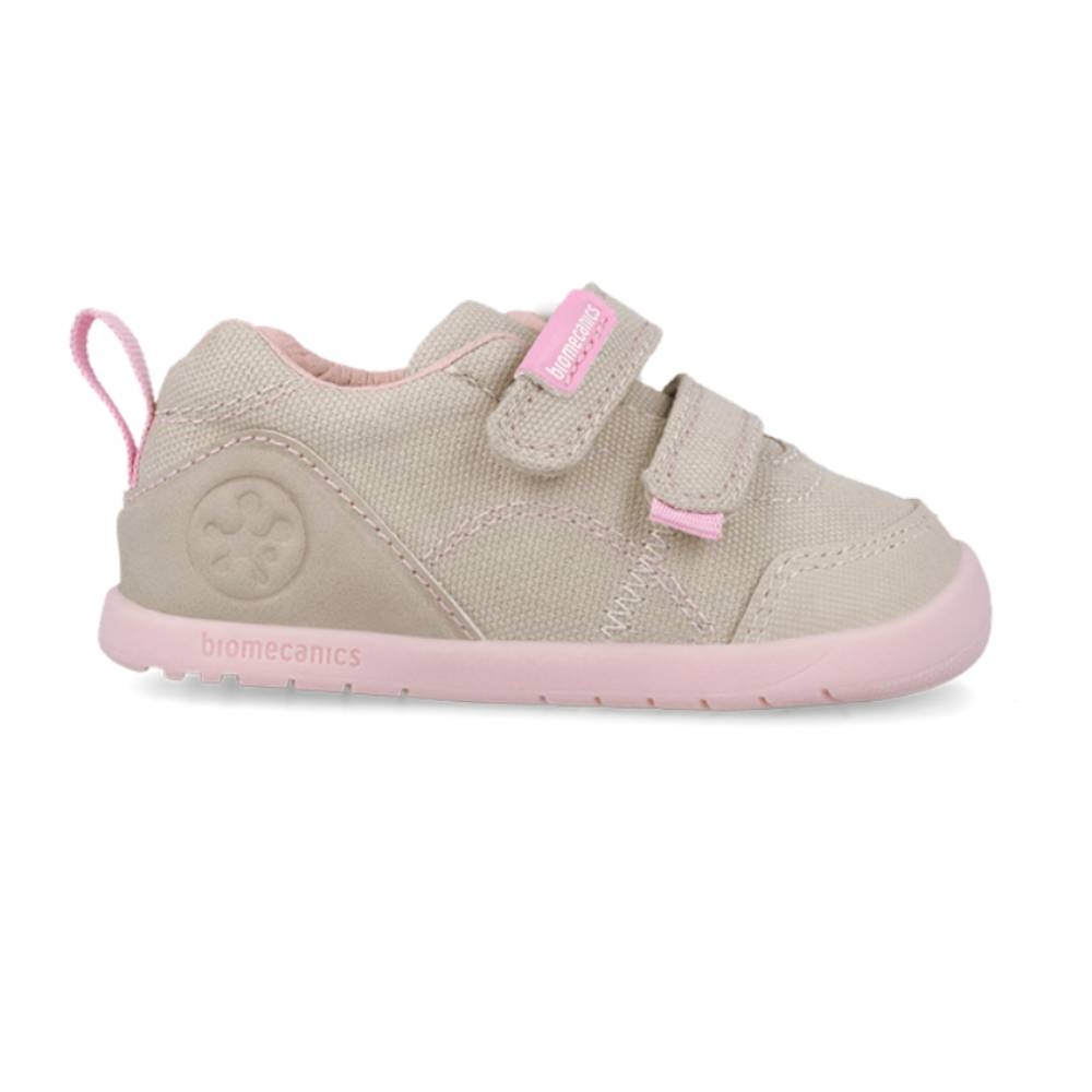 Zapatillas de lona BAREFOOT Biomecanics para primeros pasos de niña, fabricadas en textil suave y resistente de color beige combinado con detalles en rosa.