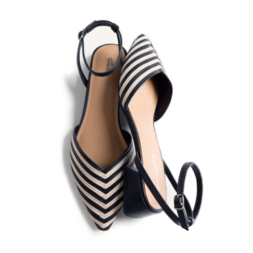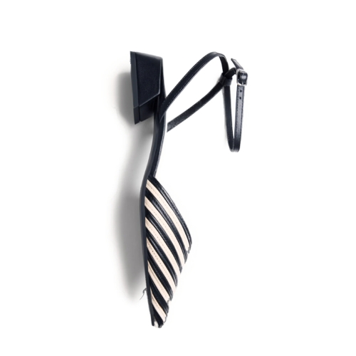 Zapatos de tacón estilo salones destalonados de piel bicolor. Punta afilada. Tacón tipo bloque en forma de trapecio. Cuentan con planta acolchada y cierres ajustables tipo pulsera. Altura tacón: 3 cm.