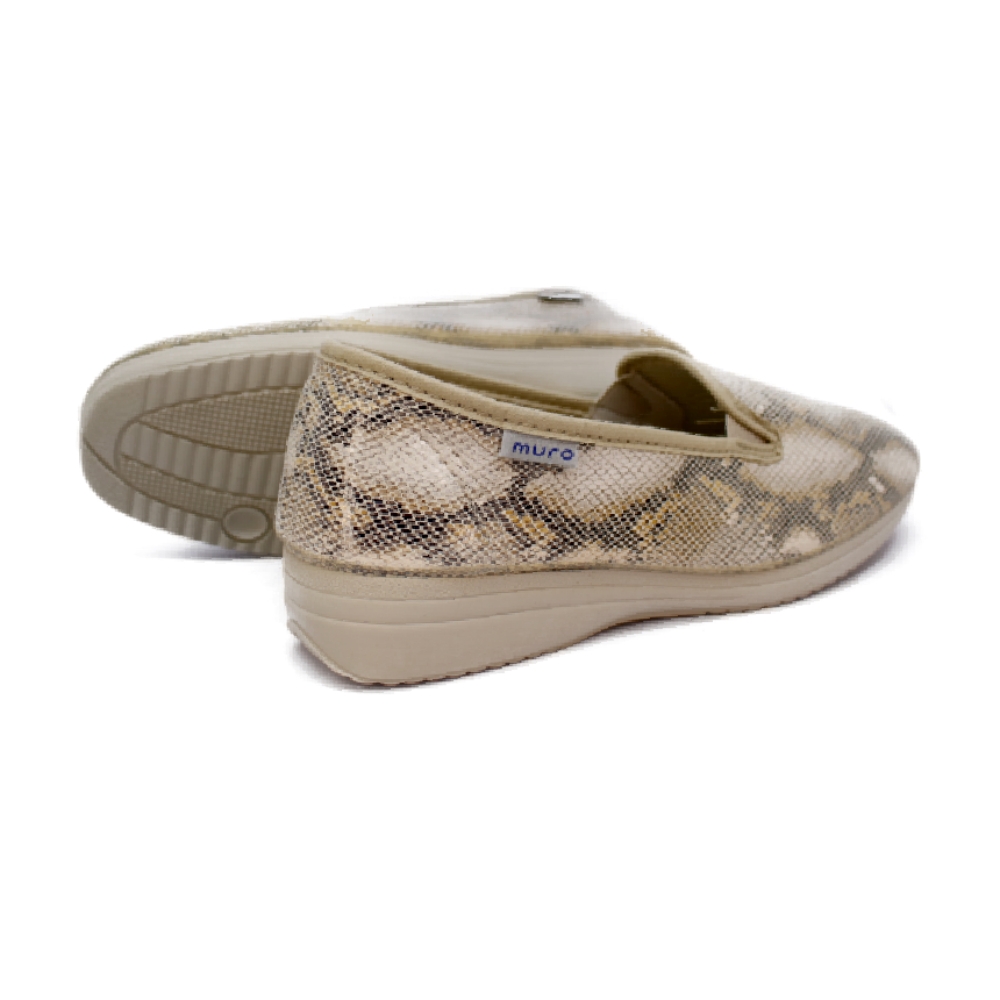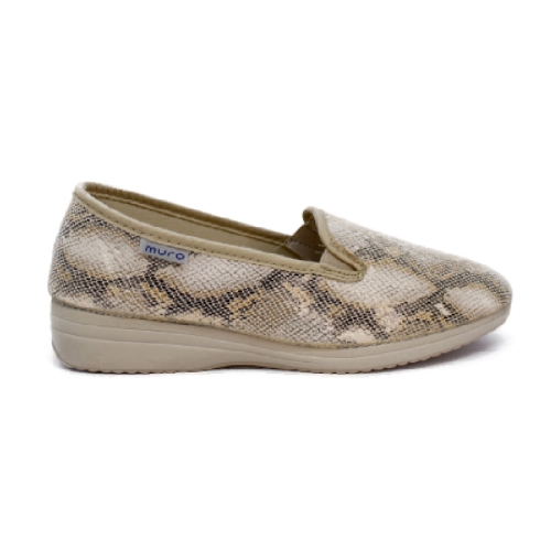Zapatilla de tejido con aspecto de mocasín con estampado de serpiente en color beige de la marca Garrido Muro. Lavables en lavadora, muy transpirables. Suela de caucho antideslizante muy flexible. Plantilla extraíble. Fabricada en España.