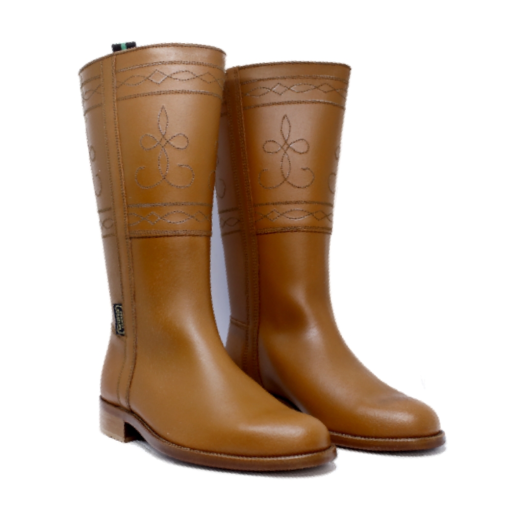 La altura de la caña es clásica de las camperas, llegando a media pierna , de  aproximadamente 32 cm . Unos bonitos bordados rocieros adornan la caña .